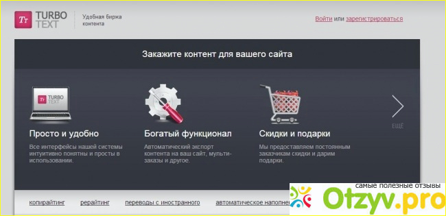 Ресурс ориентирован прежде всего на удовлетворение заказчиков. При этом они не платят комиссию, в то время как это касается исполнителей. Система довольно проста для каждой из сторон. Регистрация и навигация по сайту удобная, легко искать и размещать заказы, а также богатый функционал позволяет полноценно использовать все возможности. Турботекст одна из популярных и ведущих бирж контента в настоящее время. И это благоприятны старт для тех, кто только начинает делать свои первые шаги в нелегком деле бизнеса онлайн.
