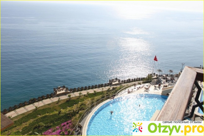 Это красивейший пятизвездочный отель в Турции, который располагается на скале в Аланье. Относится к территории древнего города Сиерда. Из окон номеров открывается потрясающий вид на Средиземное море. Концепция отдыха - ультра все включено. Для гостей имеется удобный частный пляж с двумя причалами. Он очень чистый и экологичный, имеет значок Голубого флага.