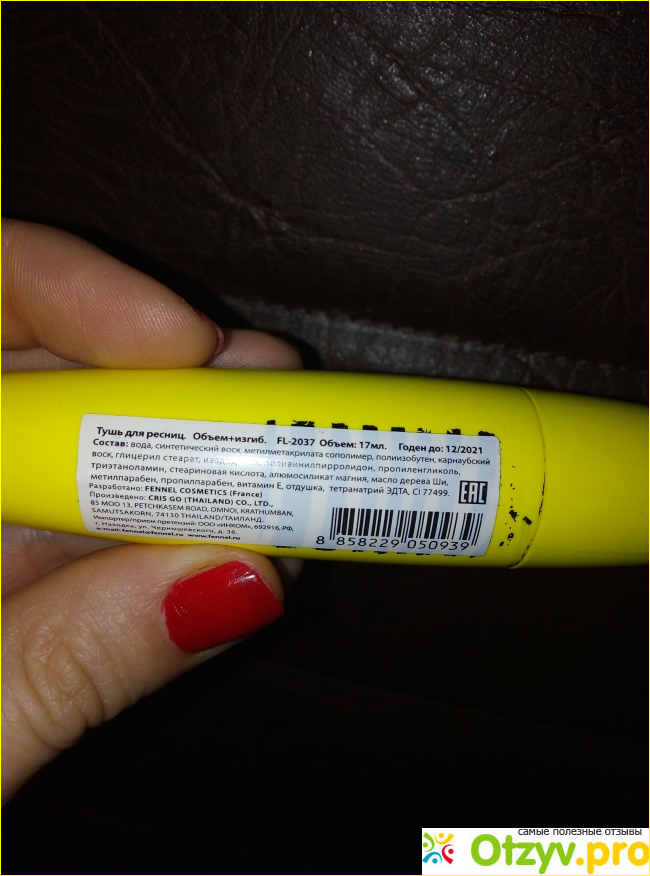От того, что тушь постоянно пользуюсь ее название стерлось. Это конечно считаю экономия нанесения названия. Но осталась наклейка. На которой есть все сведения с переводом на русский язык.