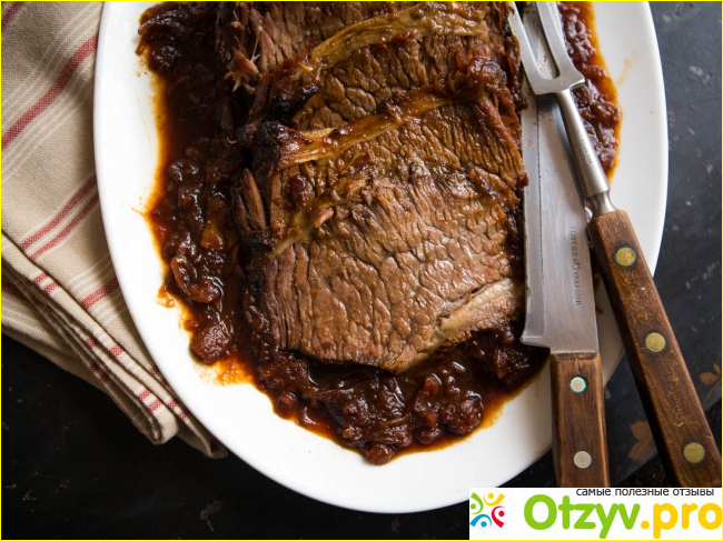 Подавать на стол: Разогреть духовку до 325F. ложкой отделить любой застывший жир от соуса. Вынуть грудинку из соуса и нарезать ломтиками против зерна. Выложите ломтики в кастрюлю и накройте соусом. Накройте блюдо фольгой и поставьте в духовку, пока грудинка не прогреется, на 30-45 минут. Подавайте немедленно.