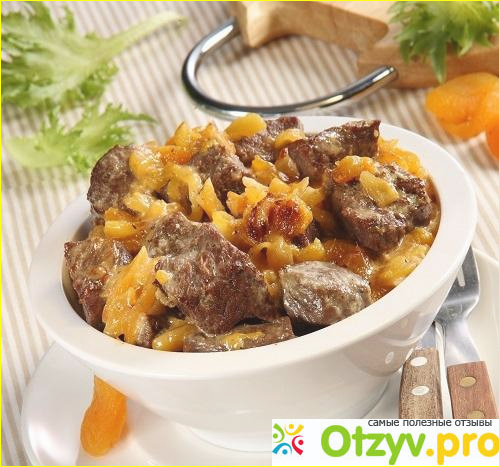 Переложить мясо в огнеупорную форму, добавить слой лука, и слой порезанной кураги. Присыпать мясо столовой ложкой муки, добавить сметану и немного воды. Посолить, поперчить, добавив специи, тщательно все перемешать и поставив в разогретую духовку тушить не мене часа.
