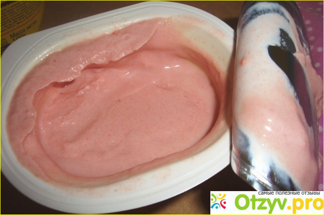 Масса однородная, розового цвета с приятным клубничным ароматом. Творог нежный средней плотности. Без попадания кусочков фруктов.