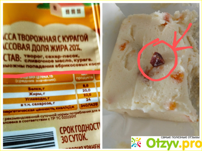 Этот сухофрукт, как известно, получают из абрикосов. Так вот, в твороге оказался осколок абрикосовой косточки, довольно большой, около 1 см по всем сторонам, и острый. Причем, производитель цинично предупреждает о такой возможности.