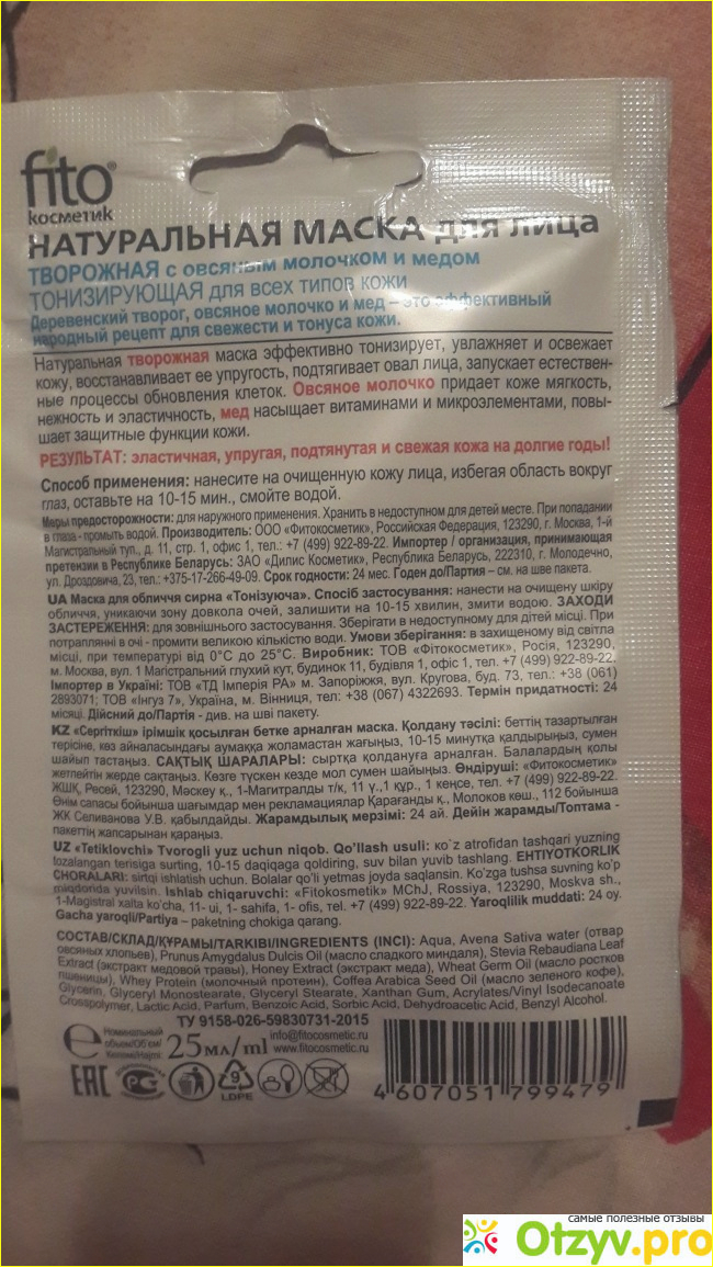 На обратной стороне пакетика указан способ применения, состав, описание маски и ее действие. Есть и информация о самом производителе