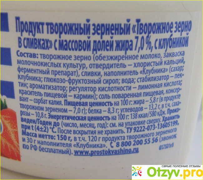 Состав у продукта хороший, хотя в нем имеется один консервант. :-( Калорийность невысокая, указана общая для творога вместе с наполнителем. Как она получилась ниже, чем у белорусского аналога (138кКал против 159кКал), при большей жирности сливок – загадка.