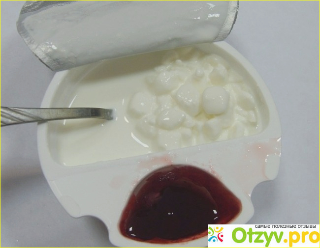 «Простоквашинский» зерненый творог в 7% сливках с фруктовым наполнителем продается в сдвоенном контейнере, где в бОльшей половинке лежит творог, залитый сливками, а в меньшей – фруктовый джемчик-наполнитель.