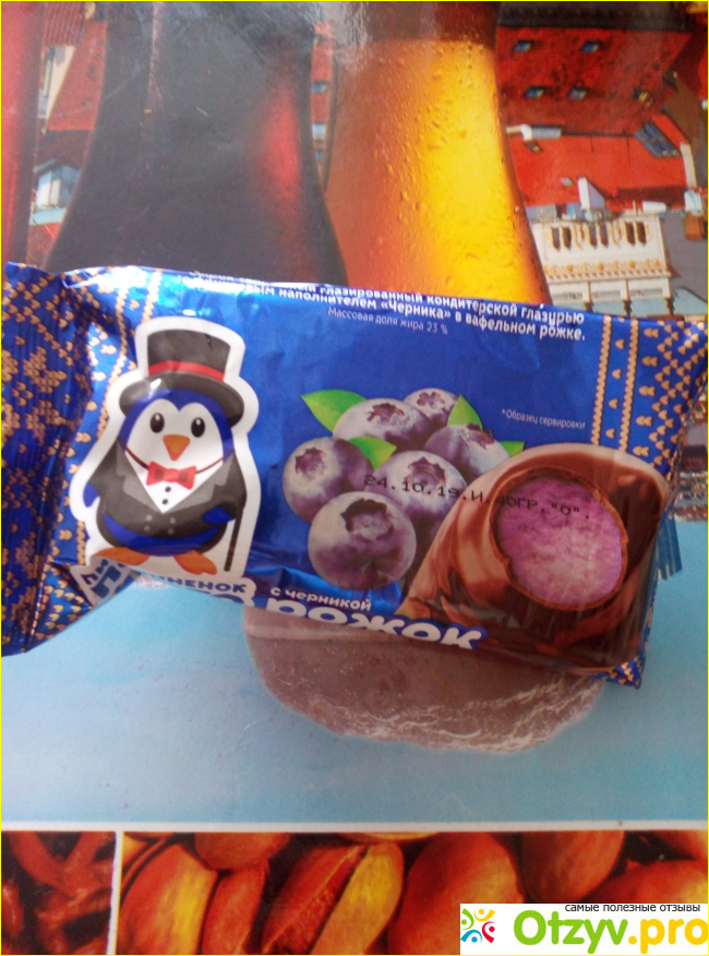 Привлекательный рожок и с видом на упаковке, так как на нем изображен сказочный пингвин. Детям такие вещи точно понравятся от одной только упаковки. А вот вкус тоже очень даже неплохой и удобно держать в руке, так как вафля не пачкает руку.