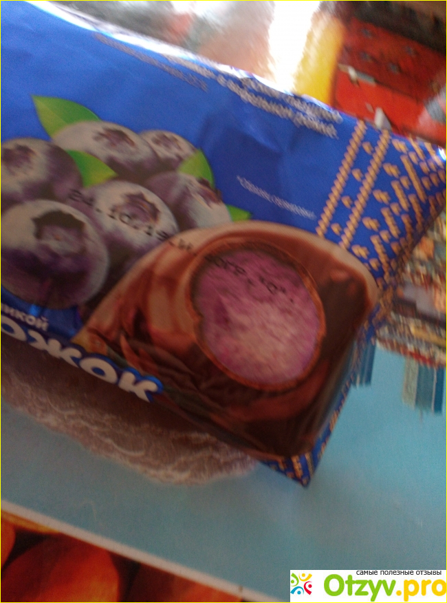 Сверху на рожке идет толстый слой шоколада, а под ним при укусе виднеется творожная масса с черничным цветом. Она относительно плотная. К зубам не прилипает. Есть сырок нам понравилось. Конечно же можно сказать, что сырок этот вредный, но покажите мне конфеты шоколадные, которые были бы полезны для зубов и просто пищеварения. Если уж любишь сладкое, то мимо не сможешь пройти. А так иногда в охоту для ребенка и себя можно позволить купить.