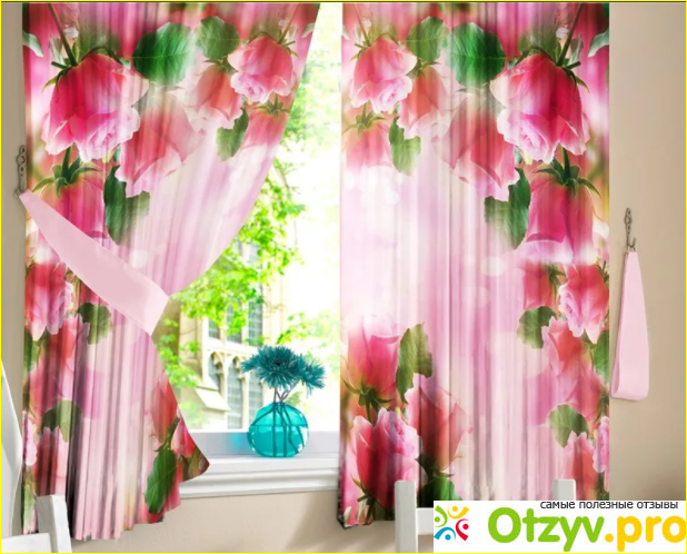 Материал легкий, смотрится красиво, если окошко приоткрыть (когда тепло) — нежно и благородно трепещет на ветерке. Полутона розового красиво играют на образующихся волнах ткани.