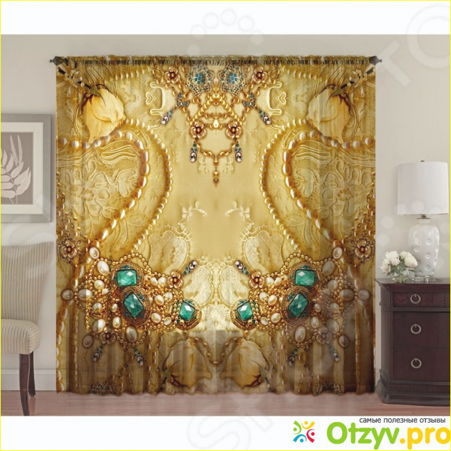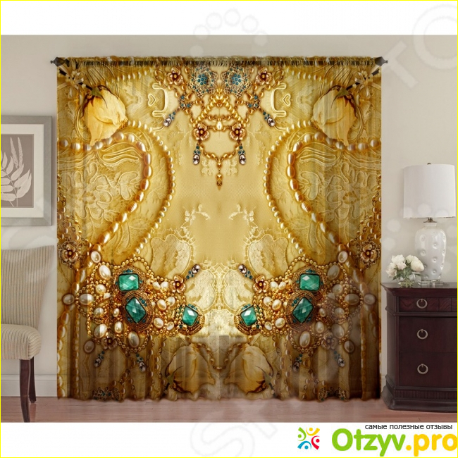 Дизайн смотрится несколько аляповато. Совсем не к месту бутоны цветов, которые, на мой взгляд, не совсем вписываются в рисунок. Приобретать такие занавески нужно с умом, оценивая момент с необычным рисунком, который выполнен в разрозненном стиле - непонятные бусины, камни сложены в бессистемный узор.