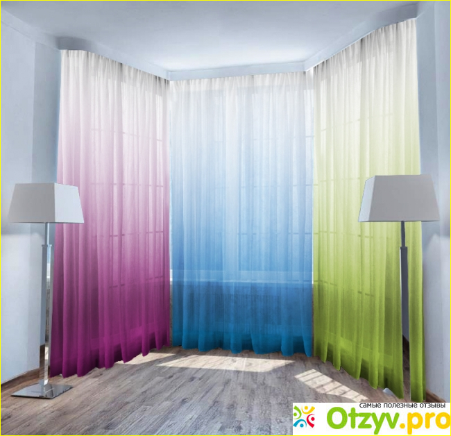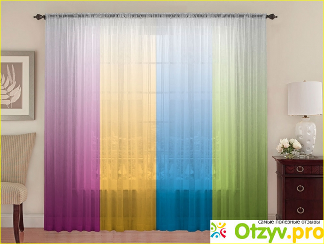 Четыре цветовых градиента — по-своему ярких, оригинальных и интересных. Они сумеют стать украшением интерьера как по одиночке, так и повешенные все сразу: такую идею нам предлагает сам создатель, показав на фотографии что сочетание градиентов тюля смотрится достаточно празднично и интересно.