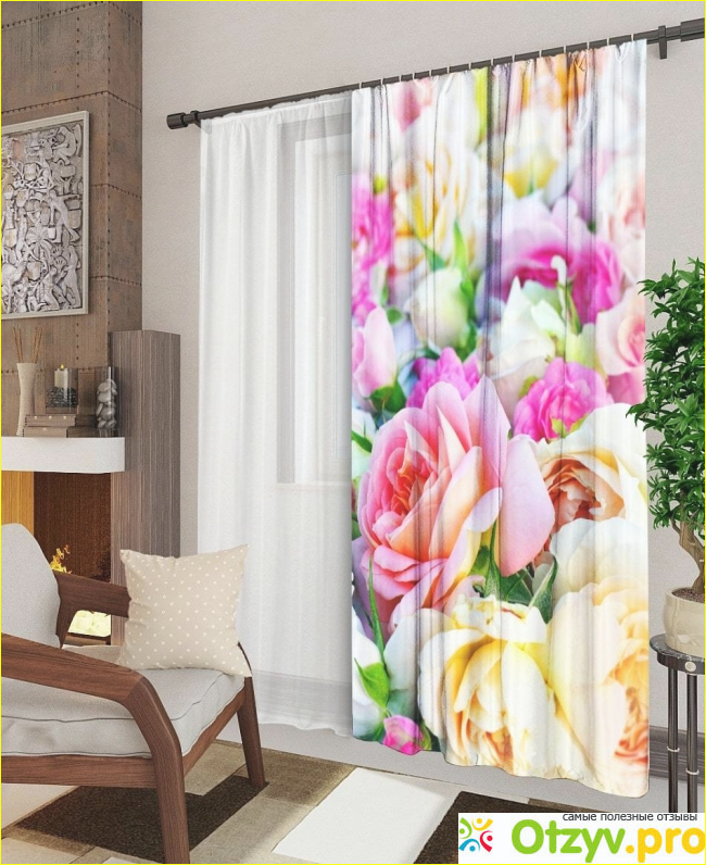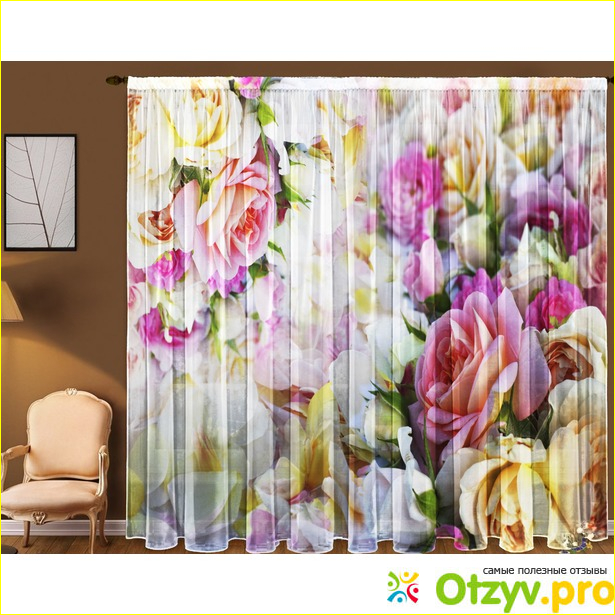 Так, в данном случае фотопечать не простая, а выполненная с применением 3D технологий: рисунок кажется объемным, настоящим, живым. Это придает тюлю необычности, красоты и оригинальности, а всему интерьеру — оживления красок.