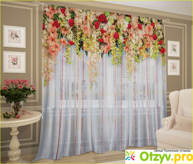 Так, в стоимость этого набора включены два полотна ткани с дорогостоящей фотопечатью, шторная лента и работа портного по шитью и прикреплению ленты.