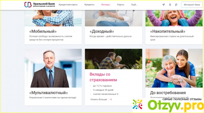 Перейдем к главному. УБРиР предлагает качественный сайт с красивым и привлекательным софтом. Сине-фиолетовое оформление приятно смотрится для глаз, а реалистичные картинки хорошо с ними взаимодействуют. Навигация по сайту крайне простая - наверху есть виджеты, по которым можно легко сориентироваться и перейти к нужной странице с необходимой информацией.