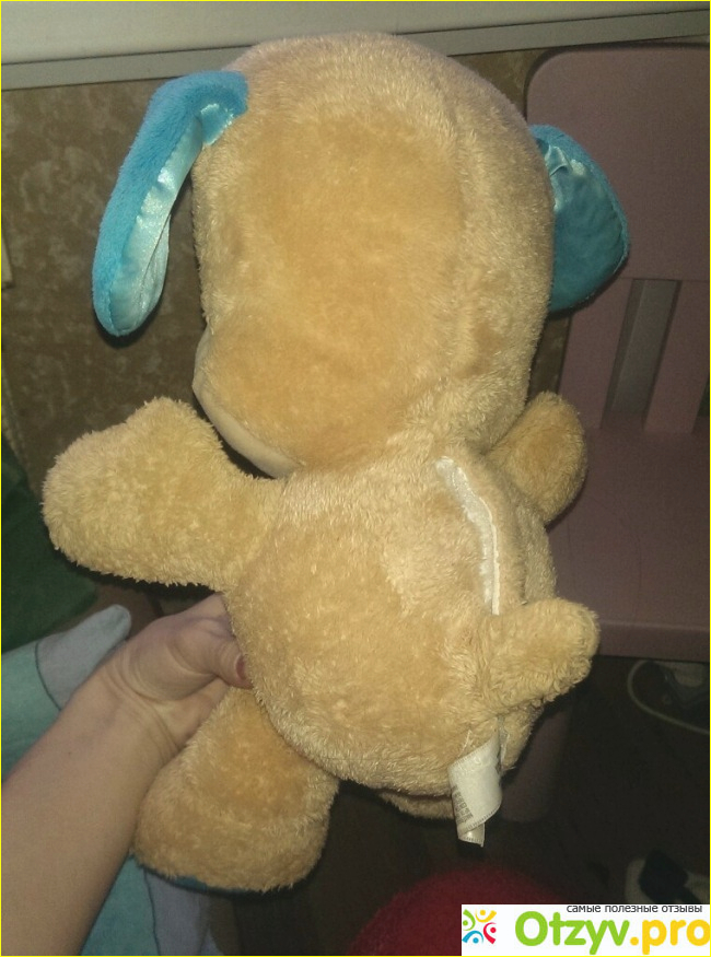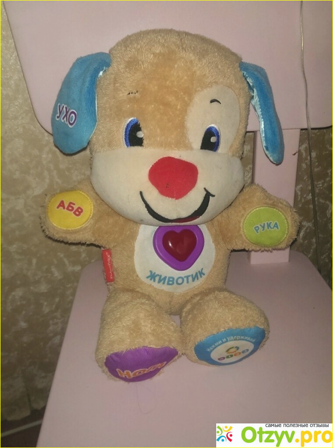 Это очень яркий и мягкий друг. А самое главное он действительно очень полезен ребенку. Моя маленькая девочка показывает где у него ручки, ношки, глазки. Вместе с щенком поет его веселые и добрые песенки, правда на своем языке, но все же). Моя девочка стала за этим щенком повторять фразы- синее ухо, желтая рка и т. д. Дочка любит его катать в коляске и спать с ним, она кормит его и баюкает. Вы знаете, у нас много разных игрушек, но не к одной из них она так не привязана как к щенку. Это действительно очень хорошая покупка для ребенка. с этой игрушкой не только можно играть, но и изучать части тела, что для первых моментов ребенка и надо.