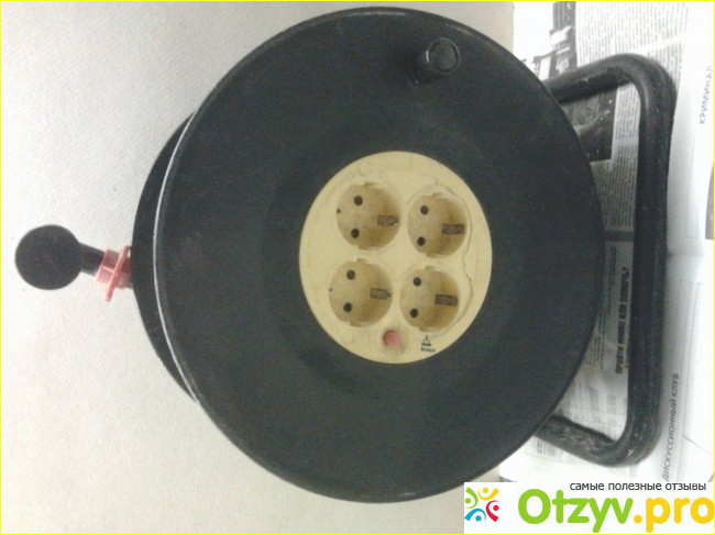 Для того что бы сматывать кабель на нем предусмотрена ручка, но уж слишком какая то маленькая, пластика пожалели что ли, не очень то удобно. Когда сматываешь то приходится постоянно придерживать катушку ногами, так как она не очень то устойчивая. Ручка достаточно удобная, сам корпус кабельной катушки состоит из металла.