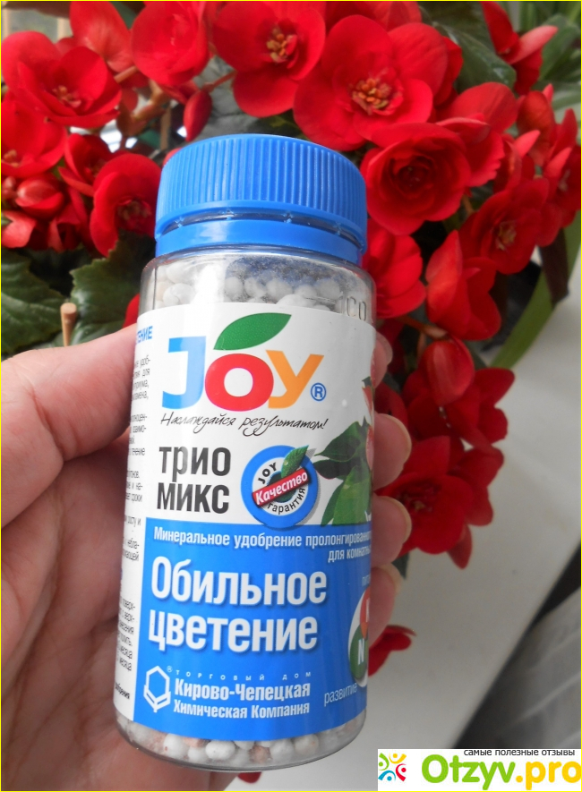 Выбор средства был случайным. В "Метро" была хорошая скидка на комплексное минеральное удобрение Joy. Оно пролонгированного действия и предназначено для комнатных цветущих растений: бегонии, примулы, фиалок, цикламена, антуриума и др. Это средство не только увеличивает количество бутонов в течение всего сезона, но и усиливает окраску цветов, продлевает срок цветения, а также предохраняет от болезней и вредителей.