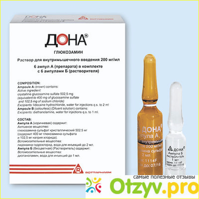Препарат Дона - это лекарство, которое назначают для регулирования обменных процессов в хрящевой ткани. Препарат выпускается в виде раствора для внутримышечного введения. В 1 мл препарата содержится 200 мг основного действующего вещества глюкозамина (в форме сульфата). В качестве вспомогательных веществ используется вода для инъекций, натрия хлорид, лидокаина гидрохлорид. В качестве растворителя используется вода для инъекций, взятая до 1 мл, а также 24 мг диэтаноламина.