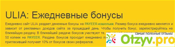 Нет так давно обнаружила для себя совершенно отрясающий сайт Ulia:Payer бонусы. Суть заключается в то, что вы заходите ежедневно и забираете свой бонус. Бонус дают, правда не большой: за сутки примерно 0.2 рубля.