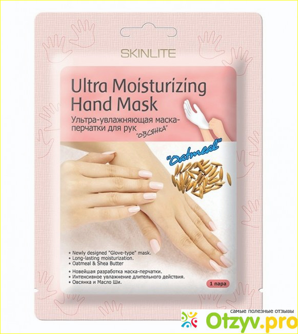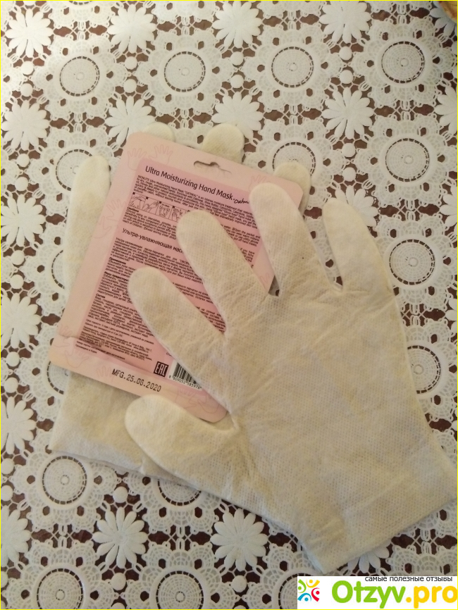 Маска-перчатки в небольшом пакетике нежно-розового цвета с подробной информацией о товаре. Производитель обещает интенсивное увлажнение, салонный эффект парафинотерапии, не выходя из дома.