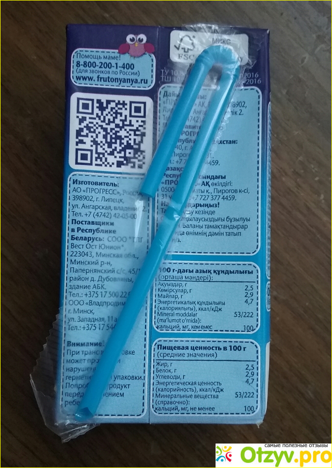 В верхней части упаковки имеется отверстие небольших размеров, в которое вставляется круглая трубочка, через которую можно пить молоко. Трубочка голубого цвета помещена в полиэтиленовый пакетик небольших размеров, который приклеен к боковой поверхности упаковки.