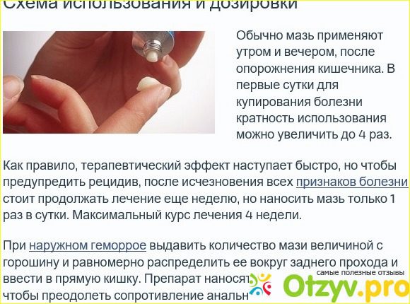 В упаковке есть специальный наконечник, предназначенный наносить мазь на внутренние узлы геморроя. Трубочка накручивается на тюбик. Перед применением необходимо обдать кипятком. После применения вымыть при помощи мыла или порошка. После этого обдать кипятком. Хранить мазь необходимо в холодильнике. Это важно помнить, так как мазь в комнате может испортиться.
