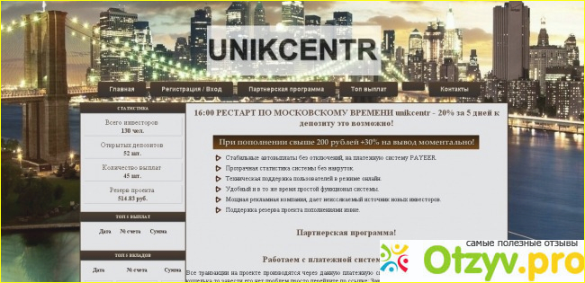На сайте unikcentr.ru описана возможность инвестировать и получить за короткий промежуток времени очень приличные проценты, а при пополнении более, чем 200 рубчиков обещают сразу вернуть 30% от этой суммы.