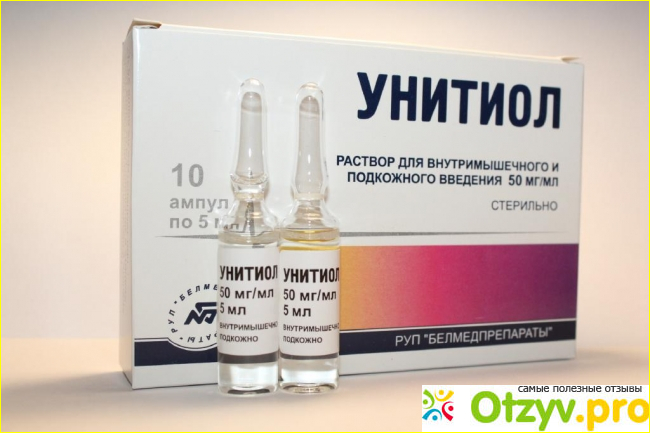 Блок также является детоксикационным препаратом, активным веществом здесь является сложное химическое вещество, называемое димеркаптопропансульфонатом натрия. Он выпускается в виде ампул для внутримышечных и внутрикожных инъекций, одна ампула содержит 50 граммов активного вещества. Прозрачный, бесцветный раствор доступен в 5 мл с различными количествами в одной упаковке. Фармакологические свойства препарата Унитиол является детоксицирующим средством, выводит из организма вредные токсические вещества, очищает организм от токсичных компонентов в тканях, крови, образует безвредные комплексы, которые выводятся естественным путем вместе с мочой. Он используется в качестве противоядия при серьезных отравлениях тяжелыми металлами, мышьяком, хромом, висмутом, алкогольной и наркотической интоксикации. Но их также можно назначать пациентам с гепатоцеребральной дистрофией, с полиневропатией у диабетиков, что улучшает работу нервной системы, регулирует проницаемость капилляров и так далее.