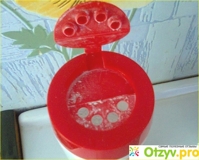 Крышечка у средства тоже удобная, открывается нажатием, отверстия как видите крупные довольно-таки, порошок высыпается легко из них, я сначала думала, что слишком много порошка будет высыпаться, но нет, это только так на первый взгляд думается. Обратно крышечка тоже хорошо закрывается, но все равно стоит держать подальше от детей, так как легко открывается банка, да и все-таки это химия, от греха подальше как говориться.
