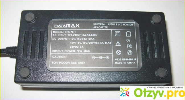 Универсальный адаптер для ноутбуков Universal Notebook Adaptor Datamax CHL70H может с успехом заменить внезапно вышедший из строя блок питания (адаптер), так как не всегда удается найти в подобной ситуации оригинальный адаптер. Этот универсальный внешний блок питания обладает выходной мощностью 70 Ватт, при этом можно выбирать выходное напряжение многопозиционным переключателем, который расположен сбоку на корпусе.
