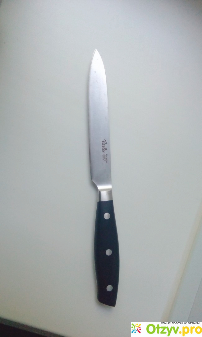 Всем доброго времени суток. Я уже оставляла отзыв о кухонных ножницах этой фирмы, сейчас в сети магазинов "магнит" проходит акция, собираешь наклейки - девяносто штук, потом за заполненный буклет с наклейками получашь скидку на ножи. Сначала я собрала наклеек на кухонные ножницы, а за второй заполненный буклет решила приобрести универсальный кухонный нож Fissler, по скидке получается сорок девять рублей он стоит.