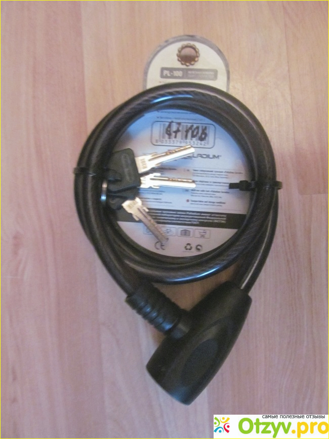 Замок длиной в 1 метр, ширина троса 1,2 см. К нему прилагается три ключа. Сам замок не маленький, а довольно внушительный. Открыть его какой попало палкой-шпилькой невозможно. Видно что он основательный и надежный, а не жалкое подобие защиты от кражи. Напугает не только своим видом, но и невозможностью как-либо его снять. А мы используем его часто - у ребенка ежедневно какой-нибудь "кружок" после школы, на который она едет на велосипеде или самокате.