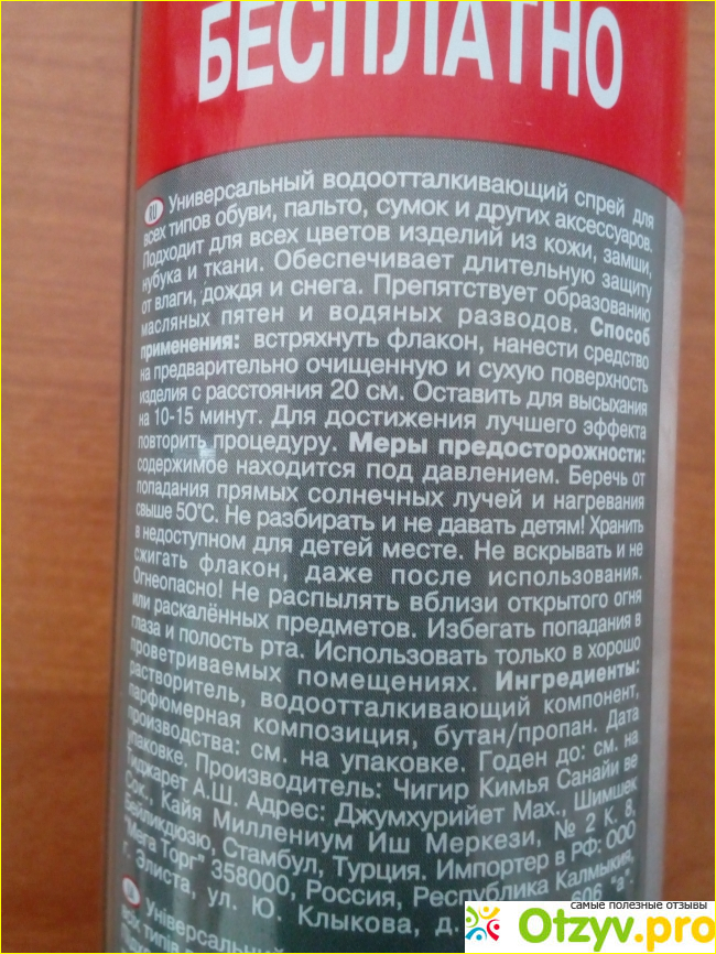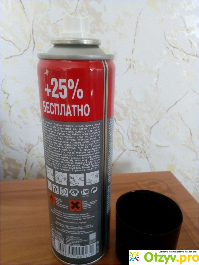 Способ применения очень простой: после встряхивания баллона распылить средство на очищенную и сухую поверхность изделия с расстояния примерно 20 см. Если обрабатываете сапоги утром перед выходом из дома, сделать нужно это хотя бы за 15 минут до ухода на работу. Время для полного высыхания должно быть обязательно (производитель рекомендует 10-15 минут).