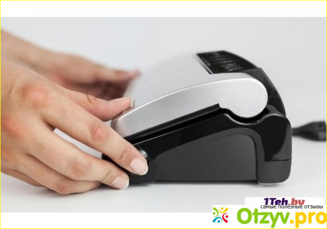 На панели можно увидеть кнопки управления - не буду специально останавливаться на этом вопросе, в инструкции все предельно ясно отмечено. Сам упаковщик работает по типу книги: сначала включаю в сеть, чтобы он разогрелся, затем подготовленные пакеты открытым концом кладу на вот эту серенькую направляющую и закрываю верхнюю часть. Он сначала откачивает воздух, а потом паяет край (если этого недостаточно, то можно повторить еще раз, сделать двойной шов).