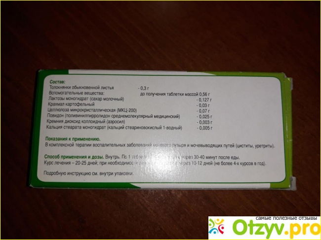 Этот препарат содержит действующее вещество листьев толокнянки, плюс дополнительные вспомогательные компоненты: молочный сахар, картофельный крахмал, микрокристаллическую целлюлозу, медицинский поливинилпирролидон, стеарат кальция. Выпускается в виде таблеток, относится к мочегонным, противовоспалительным и антисептическим средствам. Итак, механизм действия обусловлен мочегонными и уроантисептическими свойствами. Этот эффект основан на комплексе растительных компонентов, под влиянием которых усиливается диурез (отток мочи), уменьшение воспалительных процессов, уменьшение количества патогенных микроорганизмов, уменьшение болевого синдрома и неприятных дискомфортных ощущений.