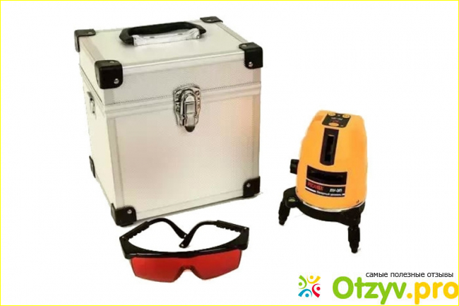 Изнутри кейс выстлан материалом, все комплектующие: уровень, брошюрка с характеристиками технического свойства и инструкцией к применению, очки, ремень для переноски и батарейки (три штуки) в ячейках.