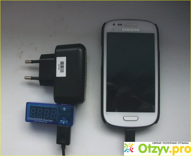 Устройство подключено к стандартному зарядному устройству смартфона. Хорошо виден недостаток компоновки. Выступающая часть может мешать нормальному включению в розетку.