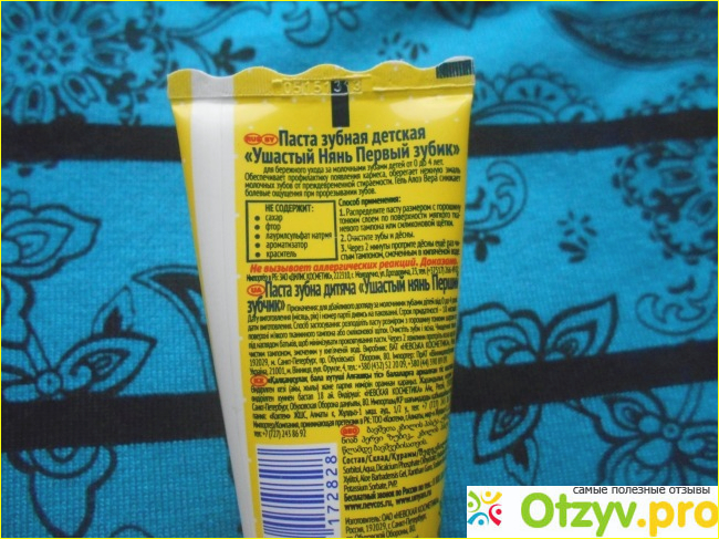 Данная паста не содержит сахара, фтора, красителей и ароматизаторов. Поэтому безопасна даже для самых маленьких, т. к они еще не умеют выплевывать остатки пасты. Возрастная категория указана от 0 до 4 лет. И еще за счет того, что в составе пасты есть алоэ вера уменьшаются болевые ощущения при прорезывании зубов, что тоже важно!