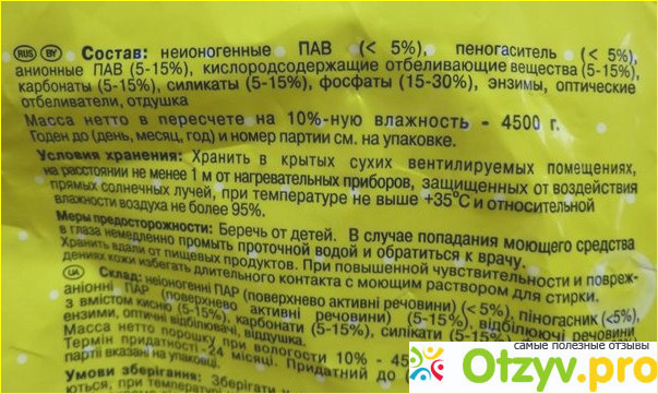 Дома посмотрела состав и расстроилась. Рука не поднялась выбросить этот порошок - упаковку 2,4 килограмма, стала стирать им взрослое белье и прополаскивать два раза. На рекомендованную дозу для стирки не смотрю, белье я меняю часто и сильно застирывать его не приходится, поэтому кладу порошка совсем немного.