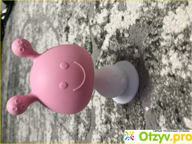 На нем есть два сосочка, напоминает сосок матери, один мягкий, другой жесткий. Мы дуем пока мягкий. На ножке внутри есть шарик, он не раздражающе звенит. Ещё ножка как присоска, приклеивается к столу. Держится очень прилично. А когда малыш подростет, голова у прорезывателя выворачивается и превращается в стаканчик. Очень понравился такого роду прорезователь. Есть минус , на него собирается мелкий мусор и волосы. Но не страшно, все смывается легко водой.