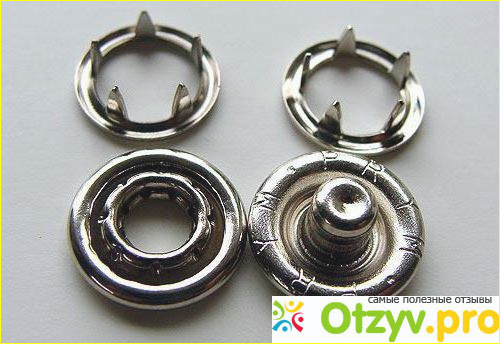 Кнопка в разобранном виде имеет всего 4 основные части, две из которых вставляются в одну часть ткани, а другие части в противоположную, куда и будет застегиваться механизм на изделии.