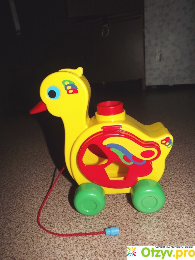 - Сама утка на колесиках с веревочкой. Ребенок может легко катить ее по полу. Моя почему то любить просто носить ее за веревку и за крылья.