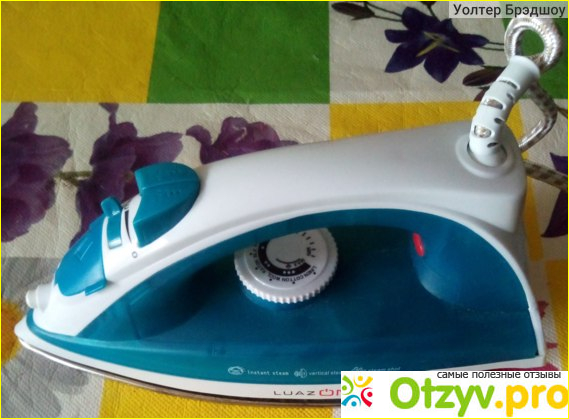 Сам дизайн утюга показался мне несколько простецким, ну да ладно, не по улицам вышагивать с ним, не красоваться перед женихами, лишь бы гладил белье. По габаритам несколько уступал моему старому утюгу, но даже так лучше – огромный утг трудно держать в руках, устают записаться, а здесь такой ми-ми-мишный малыш. Цвет белый с бирюзовым (или как его там называют), все функции в наличии: емкость для воды, кнопка для отпаривания и разбрызгивания воды, регулятор температуры, шнур длинный, с наконечником на оси, чтобы не ломался, подошва хорошая, на ней 15 отверстий для вывода парового удара. Переключатели работали плавно, не заедали, все хорошо.
