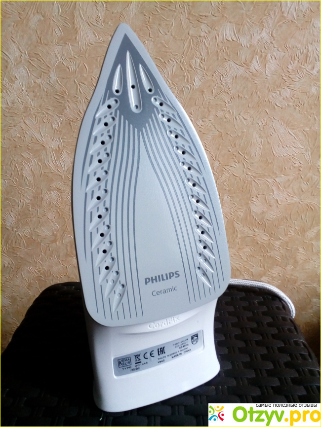 Подошва утюга сделана из керамики с отверстиями по краям, гладкая, скользящая, тоже удобная при использовании.