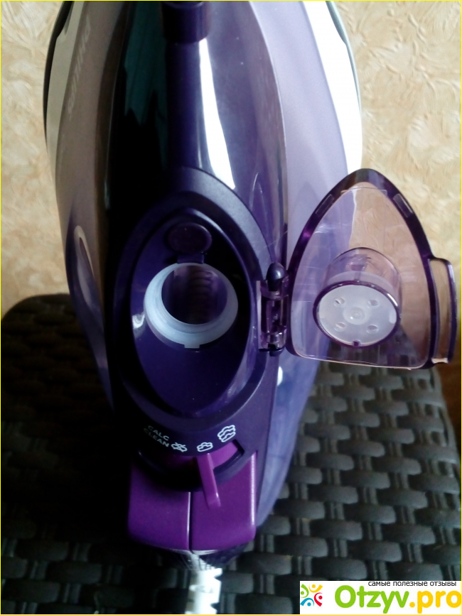 Крышка наливного отверстия открывается слева направо (похожа на небольшую прозрачную дверку), само отверстие небольшое, но прекрасно подходит для крана. У других утюгов обычно дополнительно в комплекте есть мерные стаканчики для заполнения утюга водой, у данной марки утюга его нет, но и нет необходимости им пользоваться, потому что устройство прекрасно подходит для заполнения водой из крана (как я писала выше).