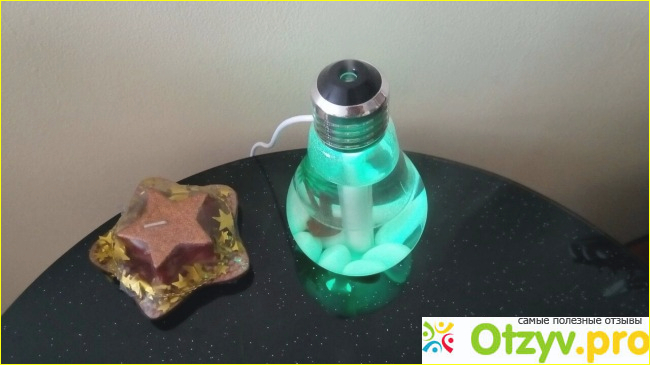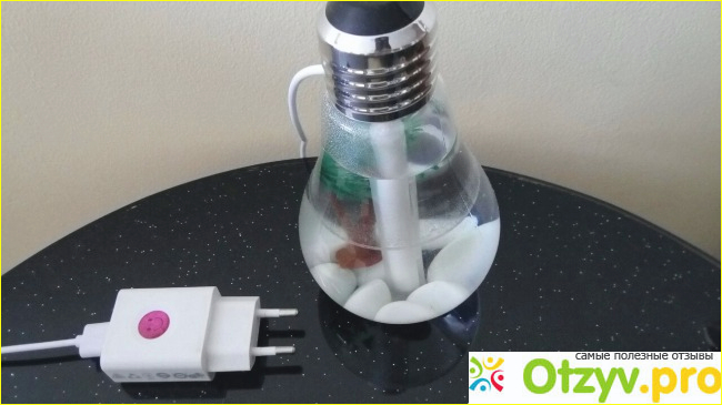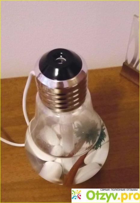 Сразу бросился в глаза ночник в виде лампочки, я еще удивилась почему он оказался в категории увлажнителей. Оказывается - это увлажнитель воздуха с подсветкой, объемом в 400 мл. Подсветка всех цветов радуги, можно использовать просто как ночник. Подключается при помощи usb входа, однако при наличии переходника, работать может от любой розетки. Переходник, к сожалению в комплект не входит, но купить его вполне не сложно, я использую тот, что шел в комплекте с телефоном.