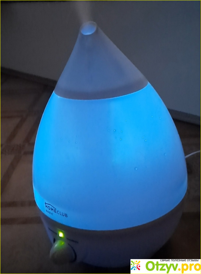 Прибор в виде капли, имеется подсветка. В вечернее время еще и как релакс светильник работает. Парит и переливается всеми цветами радуги. Я очень довольна. Имеется несколько режимов парения. Воздух вокруг прохладный и влажный. Иногда добавляю ароматические масла.