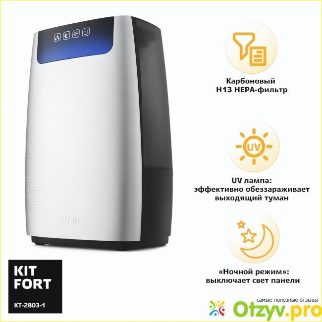 Я купила увлажнитель воздуха KITFORT КТ-2803, когда он только появился в новинках. Модель мне сражу же понравилась. Меня привлекло то, что в ней предусмотрена ультрофиолетовая лампа, пусть она не самая эффективная, но все же есть. А еще этот прибор может работать длительное время, как раз этого хватает полностью на всю ночь и захватывается часть дня. Управление в модели сенсорное, а как интересно смотрится сама модель. Лично я полностью довольная таким приобретением. Влажность в воздухе, где работает прибор действительно повышается.