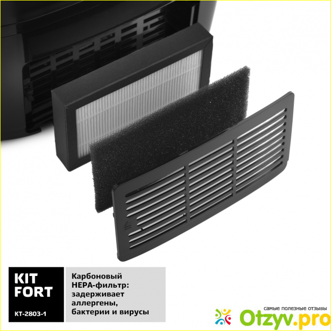 Время непрерывной работы данной модели составляет 16 часов. Этого вполне хватит полностью на всю ночь и даже небольшая часть времени еще остается. В увлажнители KITFORT КТ-2803 используется достаточно хороший фильтр. Такая модель использует в своем арсенале карбоновый HEPA-фильтр. Он отлично очищает воздух от различных бактерий, вредных организмов. И это действительно не просто слова.