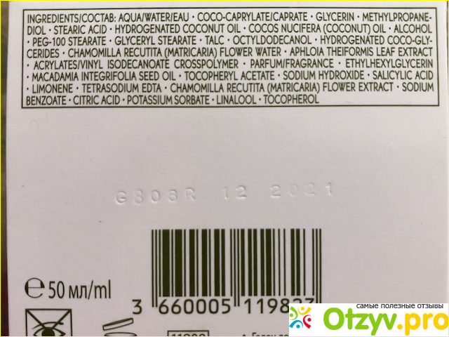 На нижней стороне упаковки размещен перечень ингредиентов крема: